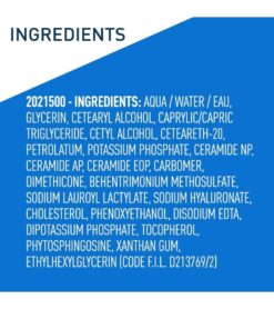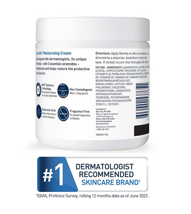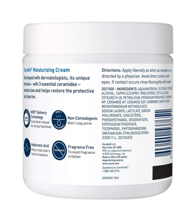 HYALURONIC ACID MOISTURIZER With hyaluronic acid. ceramides and MVE technology for 24 hour hydration. Rich. velvety texture that leaves skin feeling smooth. it is absorbed quickly for softened skin without greasy. sticky. feel. ESSENTIAL CERAMIDES Ceramides are found naturally in the skin and make up 50% of the lipids in the skin barrier. All CeraVe products are formulated with three essential ceramides (1. 3. 6-II) to help restore and maintain the skin’s natural barrier. DRY SKIN RELIEF A deficiency of ceramides in skin can often be associated with dry skin. which can feel itchy and look flaky. CeraVe Moisturizing Cream was shown to increase the skin’s level of ceramides after 4 weeks. DERMATOLOGIST RECOMMENDED CeraVe Skincare is developed with dermatologists and has products suitable for dry skin. sensitive skin. oily skin. acne-prone. and more. This skin care product comes with a lid seal GENTLE DAILY MOISTURIZER For face and body or can be used as a hand cream for dry skin relief. Holds National Eczema Association (NEA) Seal of Acceptance. Fragrance free. paraben free. allergy-tested. and non-comedogenic.