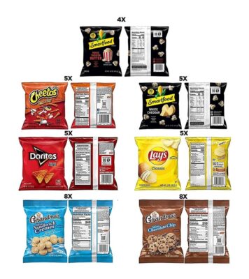 Includes (8) 1 oz bags of Doritos Nacho Cheese. (6) 1 oz bags of Doritos Cool Ranch. (4) 1 oz bags of Lay’s Sour Cream & Onion. (4) 1 oz bags of Rold Gold Tiny Twists. (4) 0.625 oz bags of Smartfood White Cheddar Popcorn. (6) 1 oz bags of Cheetos Crunchy. (4) 0.875 oz bags of Cheetos Puffs. and (4) 1 oz bags of Sunchips Harvest Cheddar