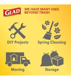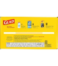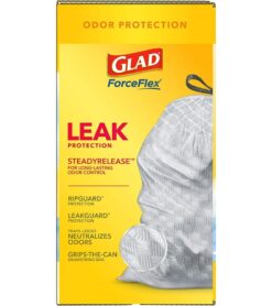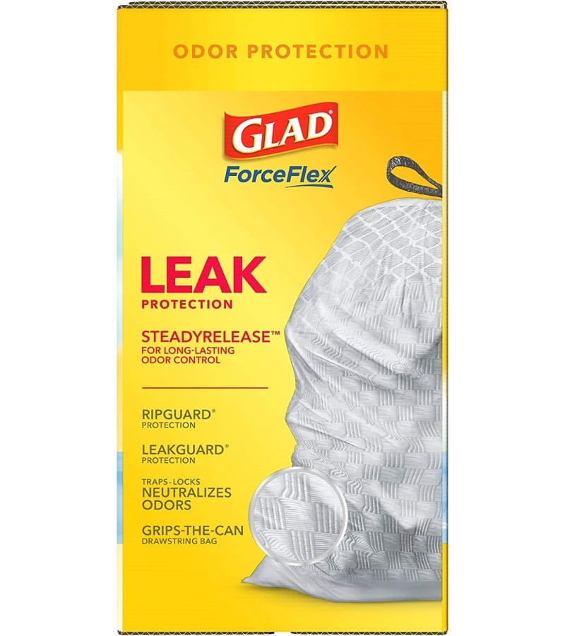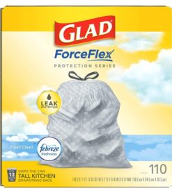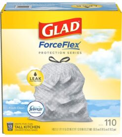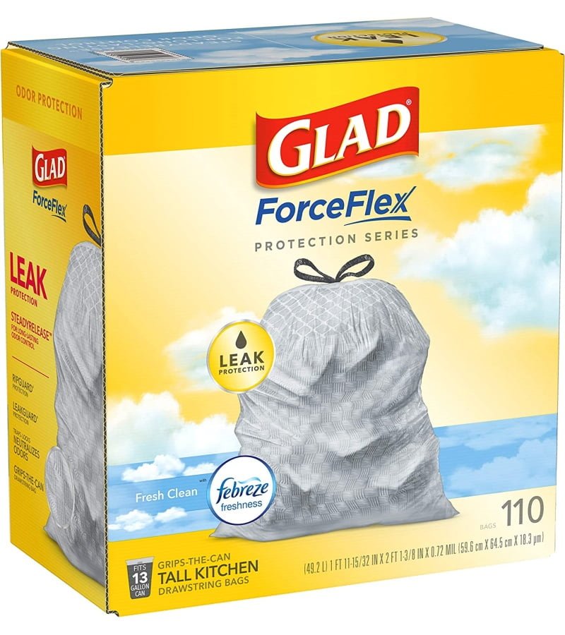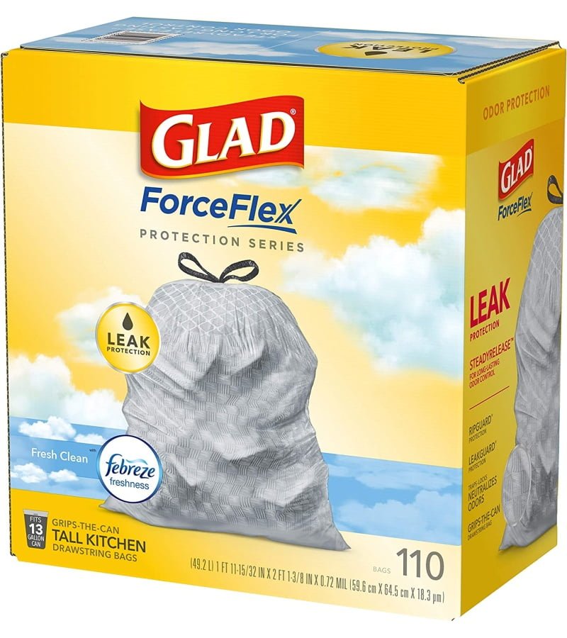 13 GALLON PLASTIC TRASH BAGS: Glad Tall Kitchen Drawstring Trash Bags with stretchable strength. traps. locks and neutralizes odors to keep your kitchen smelling fresh with a Fresh Clean scent; Package may vary