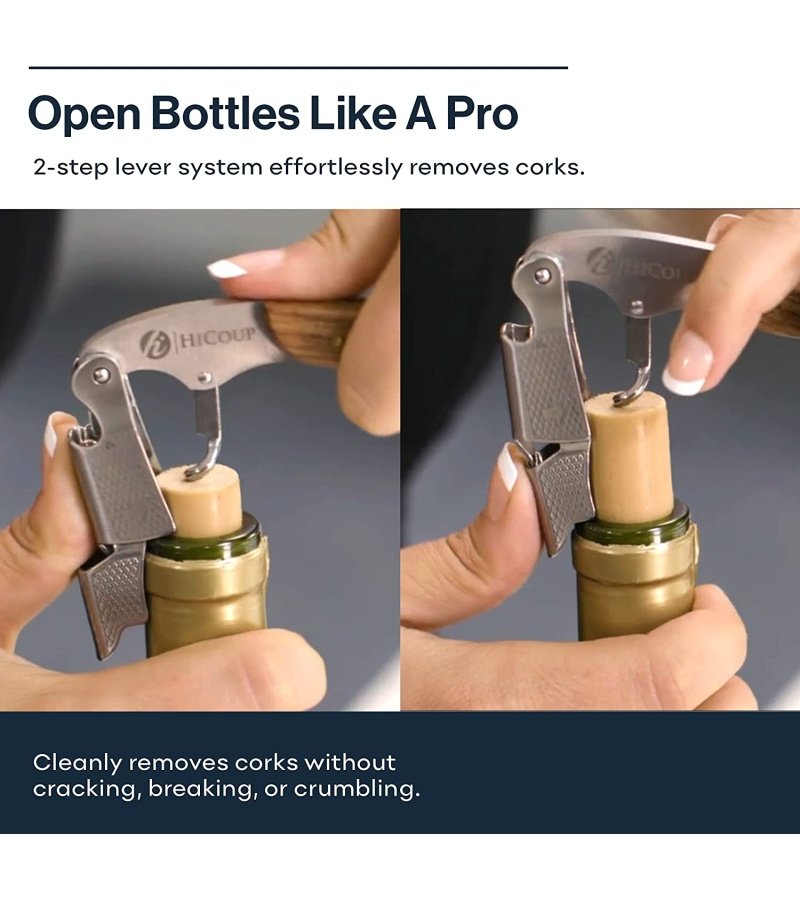 With the double-hinged lever. uncorking a wine bottle is a breeze. Simply insert the easy to use corkscrew into the neck. hook the first notch of the lever and pull the cork out halfway. Next. reposition the second notch on the ledge and pull out the cork.