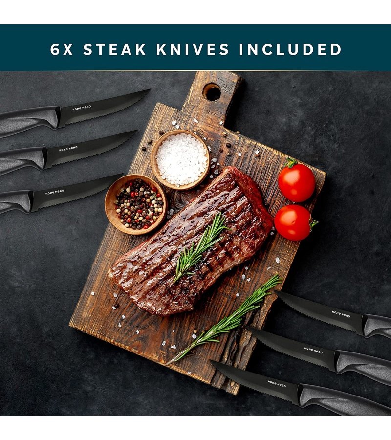 Superior Steel QualityHome Hero’s premium quality steel will effortlessly cut through anything you need: fish. meat. fruits. veggies and more. Made with 100% food-safe and rust-proof material. this knife set will be with you for years. |