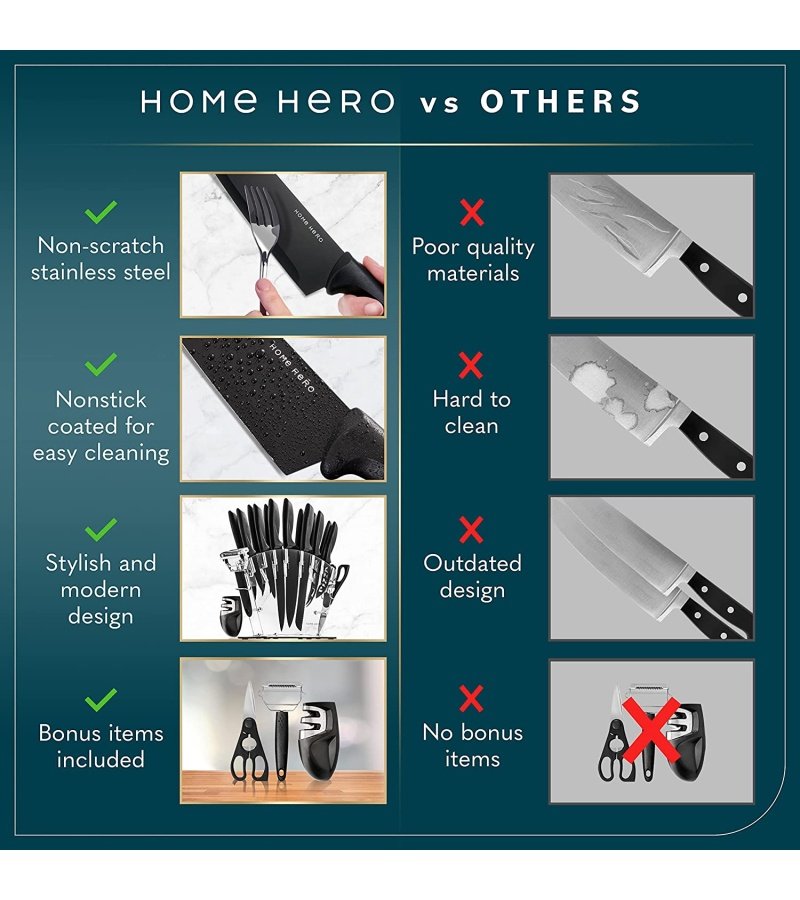 One of a kind stainless steel knife set – Home Hero brings together a unique mix of quality sharpness. great value. durability & professional crafted accuracy. Now anyone. newbie cook or master chef can enjoy cooking much faster. easier. cleaner.