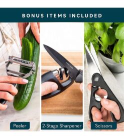 Extra Accessories IncludedOur set comes with extras that will quickly become your new essentials. Need to cut some fresh basil for your Italian dinner? Need some fresh lemon rind? Need to sharpen your knife before chopping your fajita veggies? Our set includes kitchen scissors. a peeler. and a 2-stage knife sharpener to assist you. |