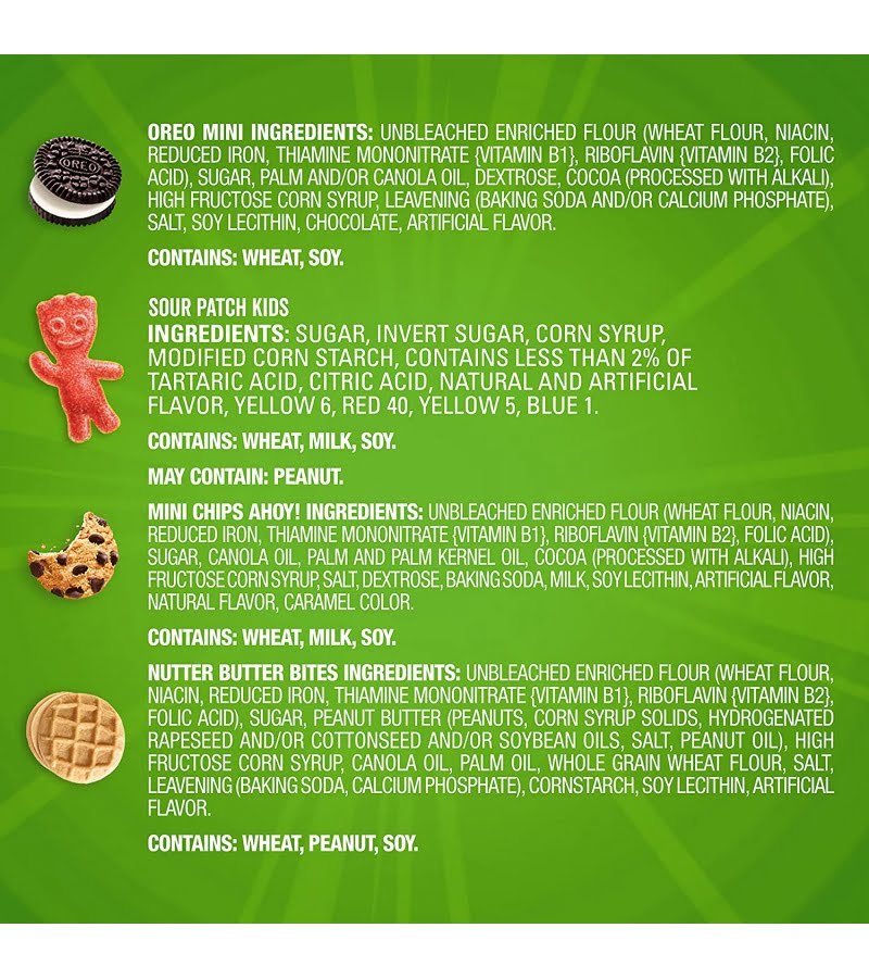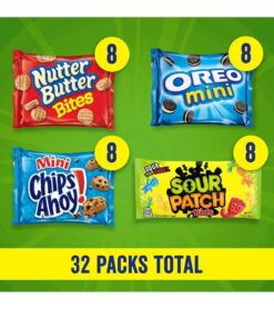 This variety package contains 32 snack packs: 8 OREO Mini Sandwich Cookies. 8 CHIPS AHOY. Mini Cookies. 8 SOUR PATCH KIDS Candy. and 8 Nutter Butter Bites
