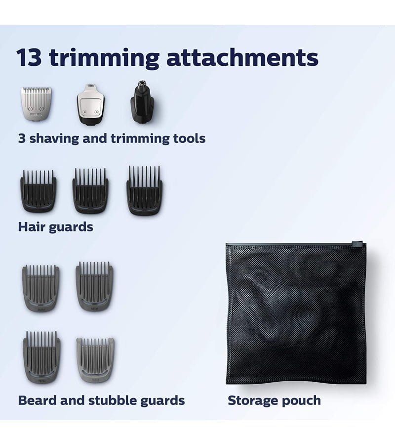 Includes a steel trimmer. a steel precision trimmer. a nose and ear hair trimmer. 3 hair trimming guards. 3 beard trimming guards. a stubble guard. an accessory storage bag. and a cleaning brush.