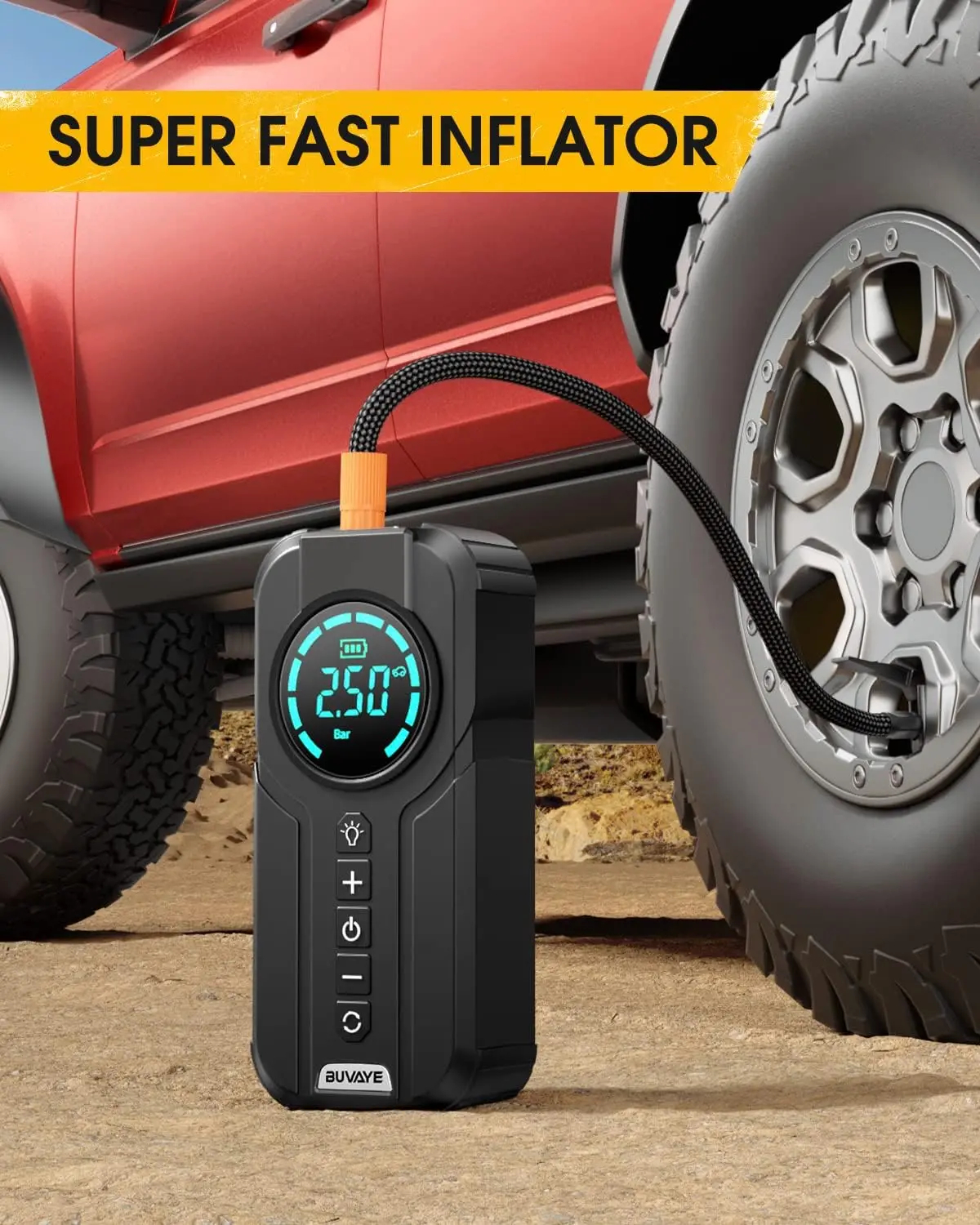 - ??Smart Powerful Tire Inflator??Our digital air compressor portable is manufactured with the unique Turbocharged Movement which is more powerful more stable and less noisy. It can provide maximum pressure of 150 PSI and airflow of 35L/Min supports tire-pressure detection Preset values stopping and unit switching (PSI KPA BAR KG/CM2) and suitable for bikes cars balls and other Inflatables.