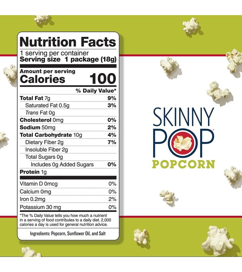 Only 100 calories per bag. Non GMO. Gluten Free. No Artificial Ingredients. Dairy Free. Peanut and Tree Nut Free; SkinnyPop popcorn has zero trans fat. zero preservatives. and is a good source of fiber