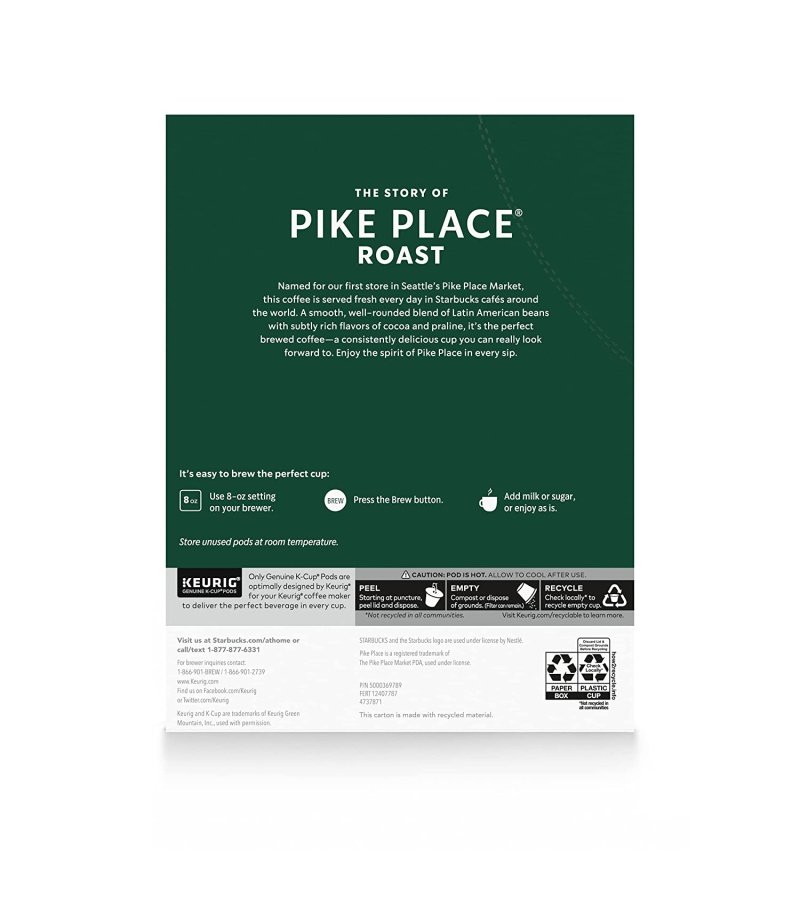 PREMIUM COFFEE IN KEURIG K-CUPS??Starbucks delivers exceptional coffee cup after cup with Pike Place Roast medium roast coffee K-Cups??96 total coffee pods for Keurig coffee makers