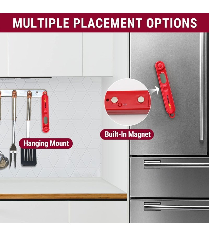 Easy to use: Kitchen thermometer with foldable probe design folds away easily and locks into base for portability; Magnetic back and hook allows for convenient storage