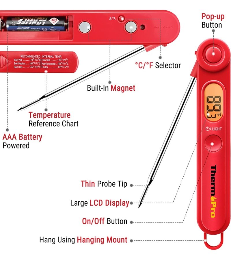 ThermoPro TP-03 is an effective solution to achieve the most accurate temperature in a matter of seconds. The digital kitchen thermometer with a simplistic yet practical design that a push of the button. the foldaway probe will pop open for quick an easy temperature reading. and when you’re done taking the temperature measurement you can fold the probe back in to ensure the probe is kept safe and clean. Don’t sweat powering the food thermometer off as it’s designed to conserve battery power after 10 minutes of no use. The meat thermometer with a backlit LCD display. reading temperatures in your preferred unit of measurement between Celsius or Fahrenheit is a breeze. Stop overcooking or under-cooking your meat and perfect meat temperatures like a professional. ensuring the perfect temp every time you’re grilling or cooking!
